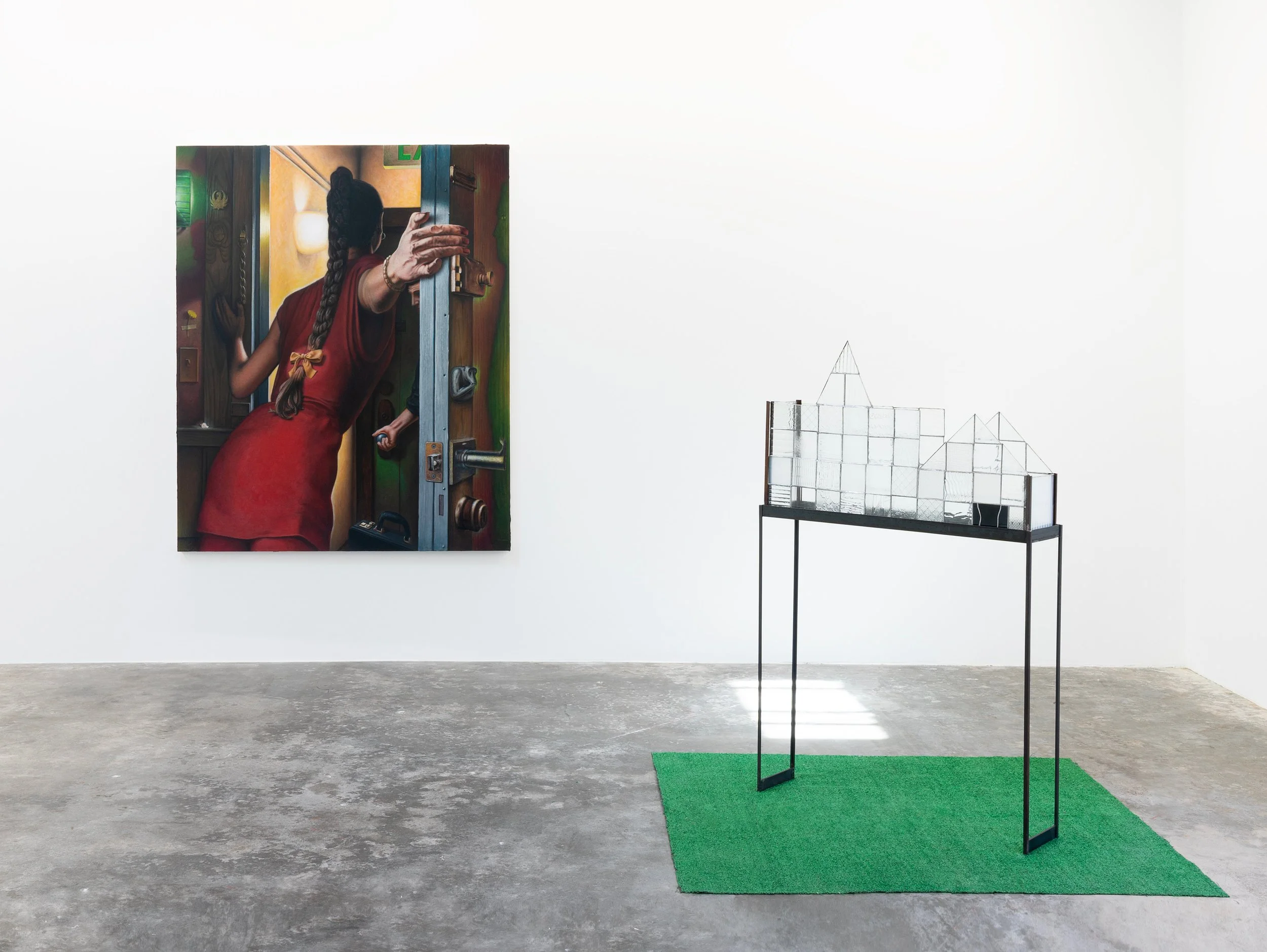 Leslie Drennan, Dreams of Domesticity, 2025 Architectural glass samples, steel, lead solder, artificial turf grass