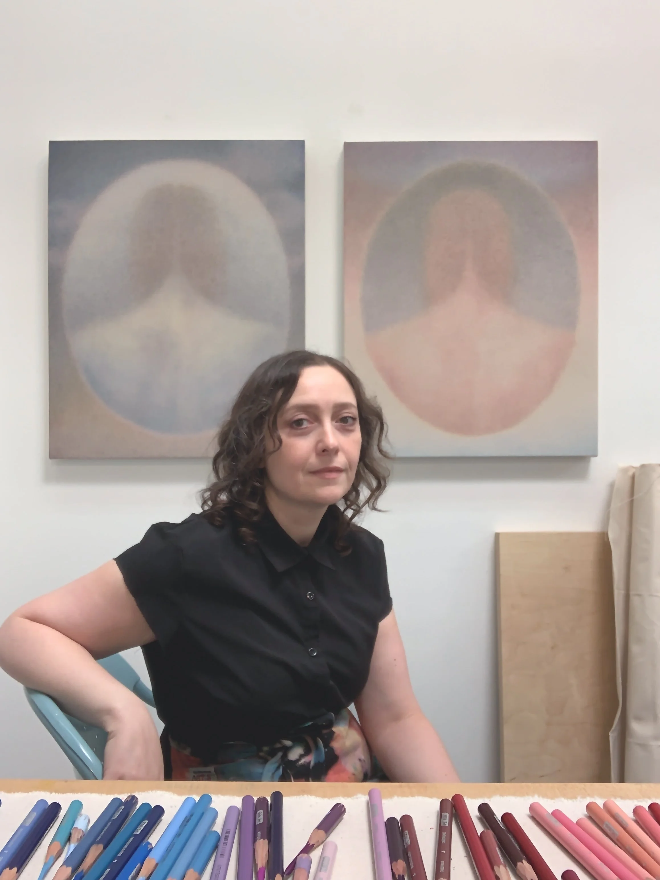 Hayley Quentin is a Los Angeles based artist using intuition and technical precision with the goal of merging the intuitive with the analytical (both in the conceptual ideation and reception of her work); using a quiet whisper, a curled finger, to beckon the viewer to linger. Quentin uses colored pencils on canvas in a wholly unique way; essentially painting with pencils using oil glazing techniques, she calls the works of this meticulous process “drawing paintings”. At first glance the eye is seduced with diaphanous color, soft and fuzzy, eliciting the viewer to come closer in an attempt to understand or gain further visual information. The closer one gets, however, the less you’ll be able to see, the pigment dissolving within the texture of the canvas. The work exists in an interstitial space, at the transitional moment where language ends and visuality takes over.